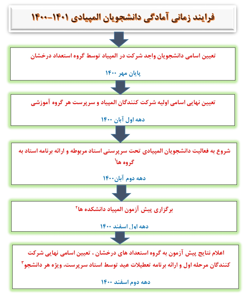 1-بسته های المپیادی مرتبط با هر رشته المپیاد،توسط گروه استعداد های درخشان در اختیار سرپرست هر گروه قرار می گیرد. دانشکده ها تا پایان آبان برنامه های تحصیلی اساتید که برای راهنمایی دانشجویان المپیادی به گروهها تحویل داده اند را پس از تحویل از گروهها، به گروه استعداد درخشان ارسال نمایند.