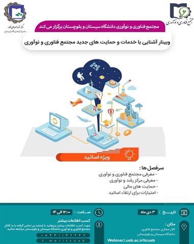 وبینار آشنایی با خدمات و حمایت های جدید مجتمع فناوری و نوآوری  جهت آشنایی بیشتر اعضاء محترم هیأت علمی با خدمات مجتمع مورخ 1399/10/3 برگزار میگردد.