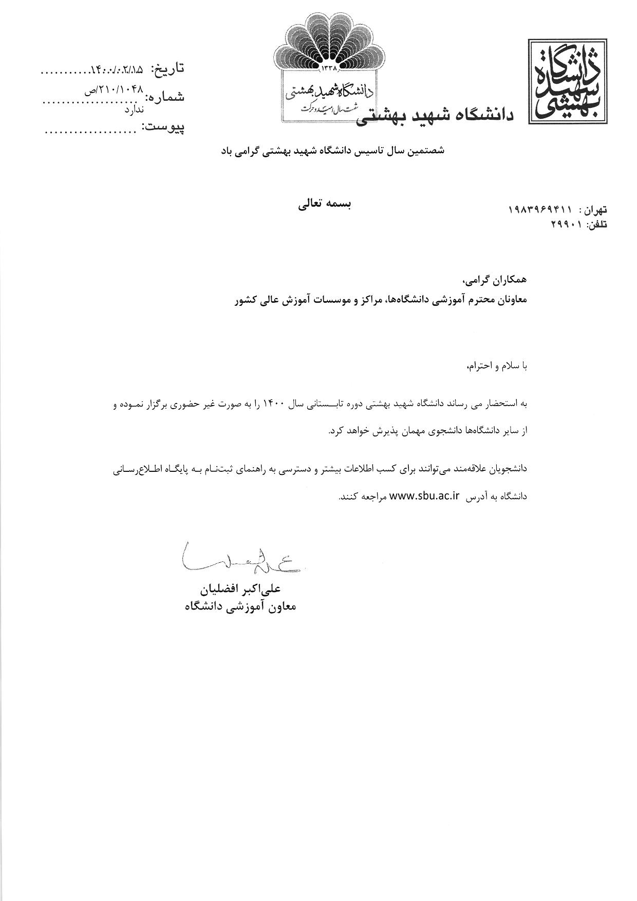 برگزاری ترم تابستان 1400 بصورت غیرحضوری در دانشگاه شهید بهشتی