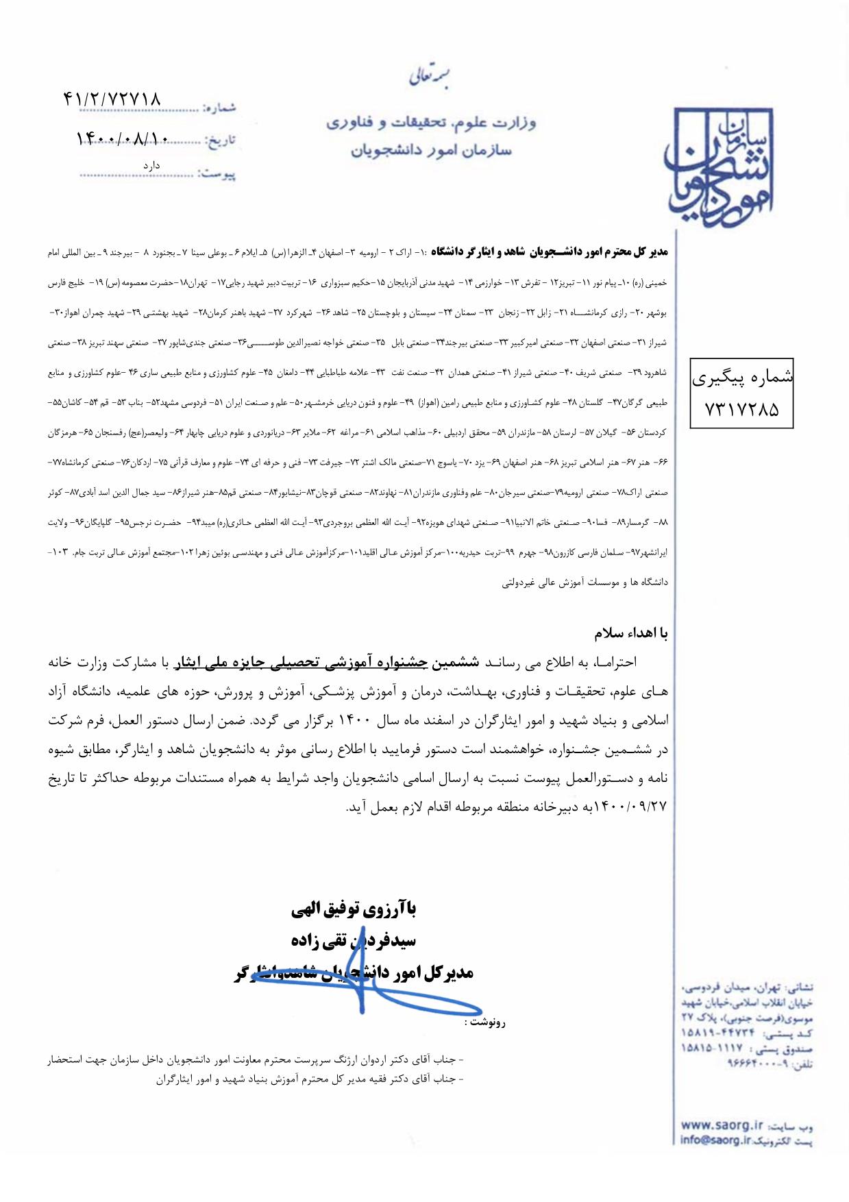 برگزاری "ششمین جشنواره آموزشی تحصیلی جایزه ملی ایثار" در اسفندماه سال 1400