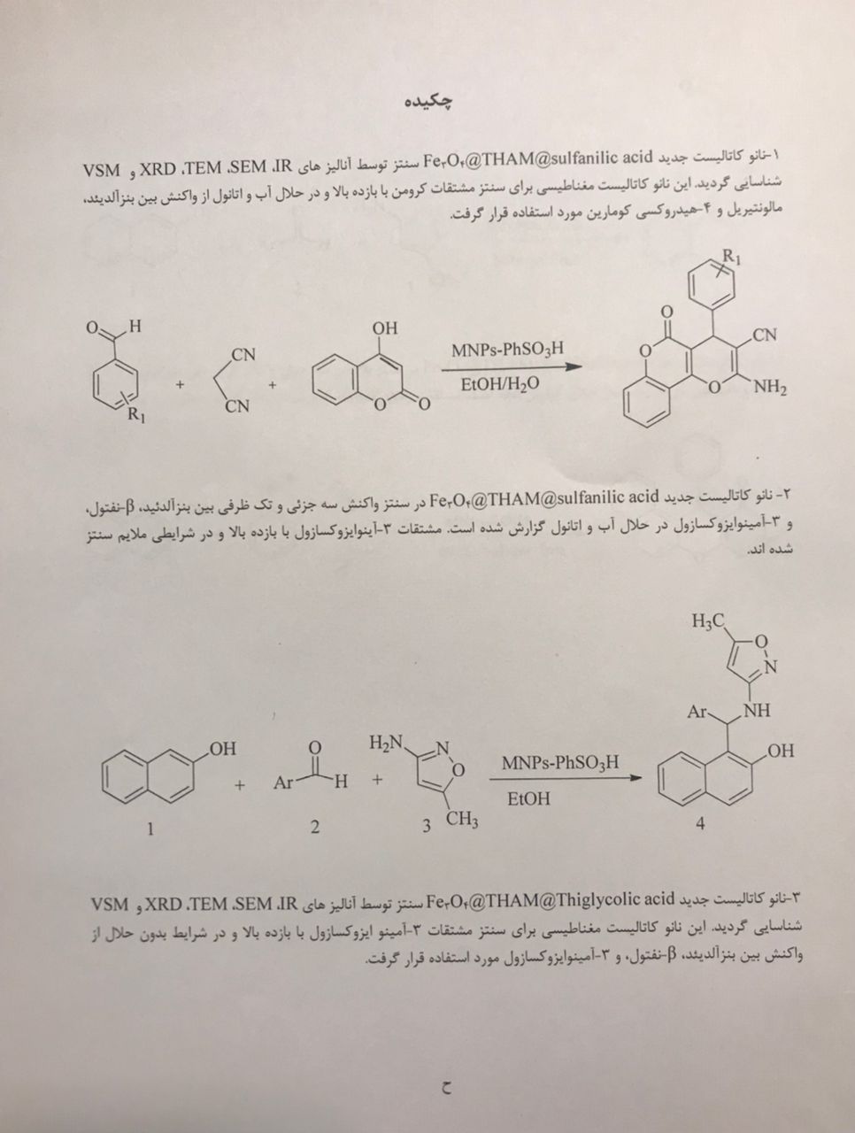 سنتز، شناسایی و کاربرد نانوکاتالیست های مغناطیسی Fe3o4@THAM@Thioglycolic acid و Fe3o4@THAM@sulfanilic acid در سنتز مشتقات 3-آمینوایزوکسازول، کرومن و زانتان