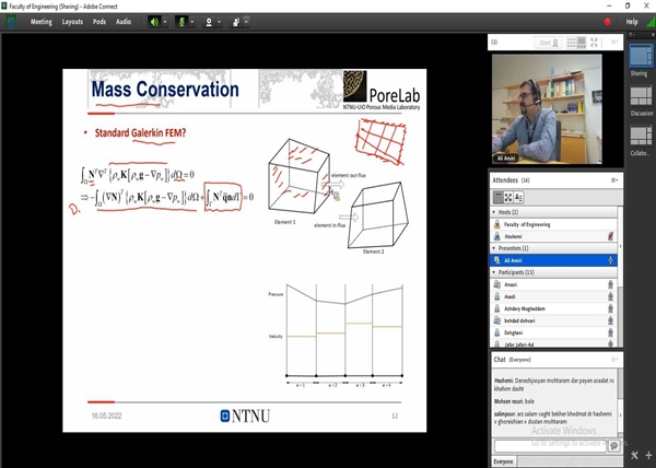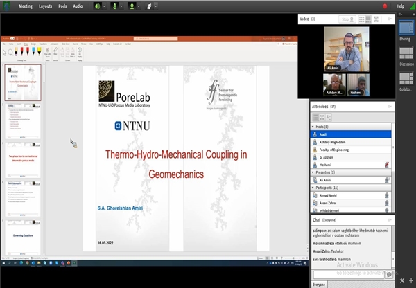 سخنرانی علمی بین المللی با عنوان "Thermo-hydro-mechanical coupling in geomechanics"در ساعت 9 و نیم صبح روز یکشنبه 26 اردیبهشت ماه 1401 توسط آقای دکتر سید علی قریشیان امیری پژوهشگر در زمینه محیطهای متخلخل از دانشگاه علم و فناوری نروژ بصورت وبینار برگزار گردید. در ابتدای جلسه  آقای دکتر هاشمی منفرد عضو هیئت علمی گروه مهندسی عمران  که هماهنگی این وبینار به همت ایشان صورت گرفت رزومه ای از فعالیتها و زمبنه های تحقیقاتی ایشان ارایه کردند و در ادامه آقای دکتر قریشیان امیری به ارایه سخنرانی علمی به مدت یک ساعت و نیم در خصوص معادلات ترمومکانیک و حل آنها پرداختند و در پایان نیز مثالهایی را برای دانشجویان نشان دادند. این جلسه با حضور اساتید و دانشجویان دانشگاه برگزار گردید و در پایان جلسه به مدت نیم ساعت سوالات اساتید و دانشجویان پاسخ داده شد.