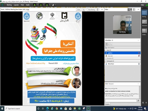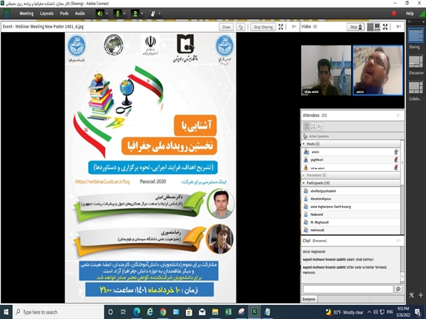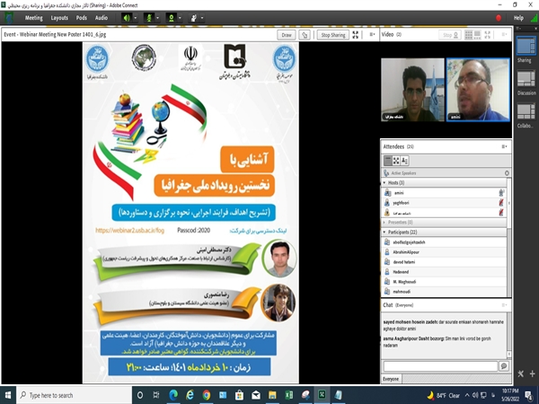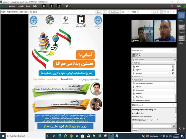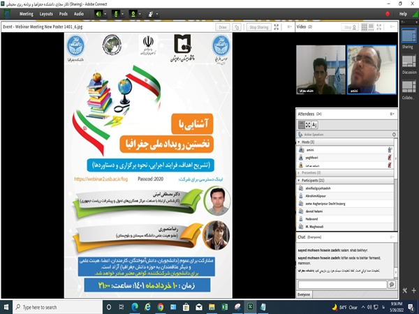 وبینار آشنایی با نخستین رویداد ملی جغرافیا، از سوی دانشکده جغرافیا و برنامه‌ریزی محیطی دانشگاه سیستان و بلوچستان در تاریخ سه شنبه 10/03/1401 در بستر ادوبی کانکت با حضور مهمان برنامه جناب آقای دکتر مصطفی امینی (کارشناس ارتباط با صنعت، مرکز همکاری‌های تحول و پیشرفت ریاست جمهوری) و به میزبانی جناب آقای دکتر رضا منصوری (عضو هیئت علمی دانشگاه سیستان و بلوچستان) برگزار شد.