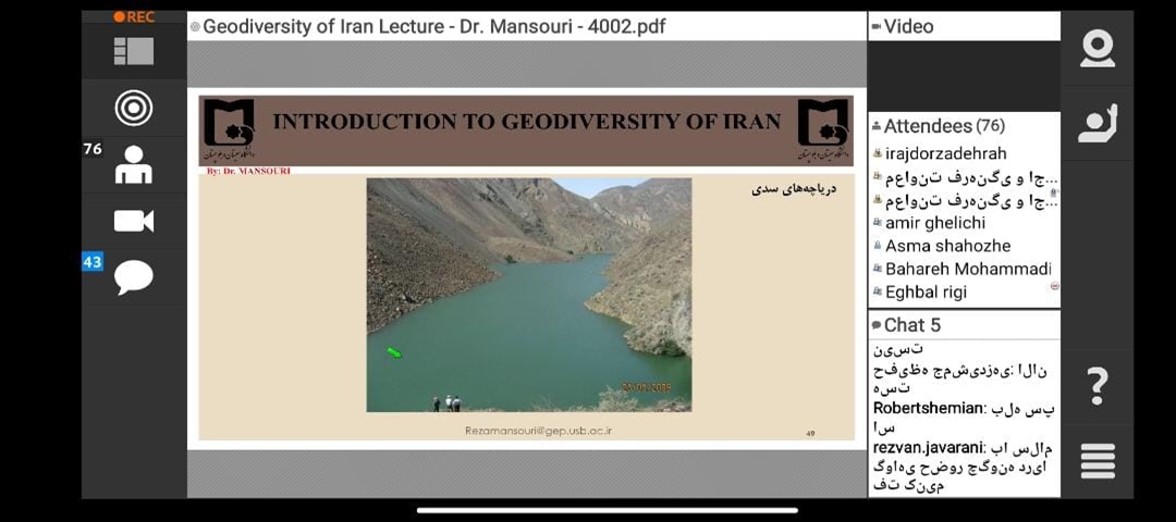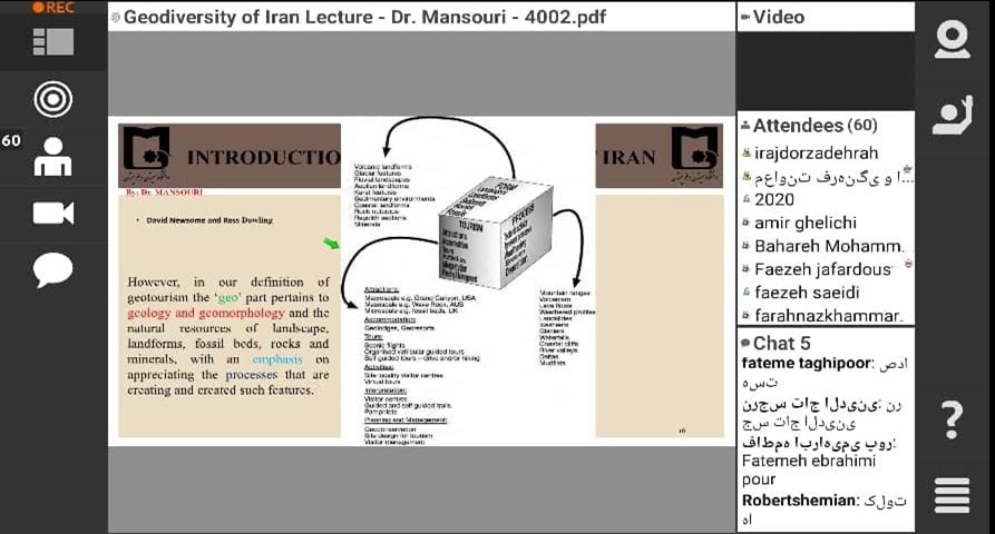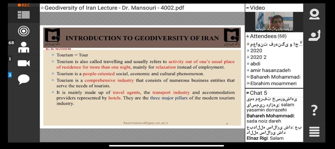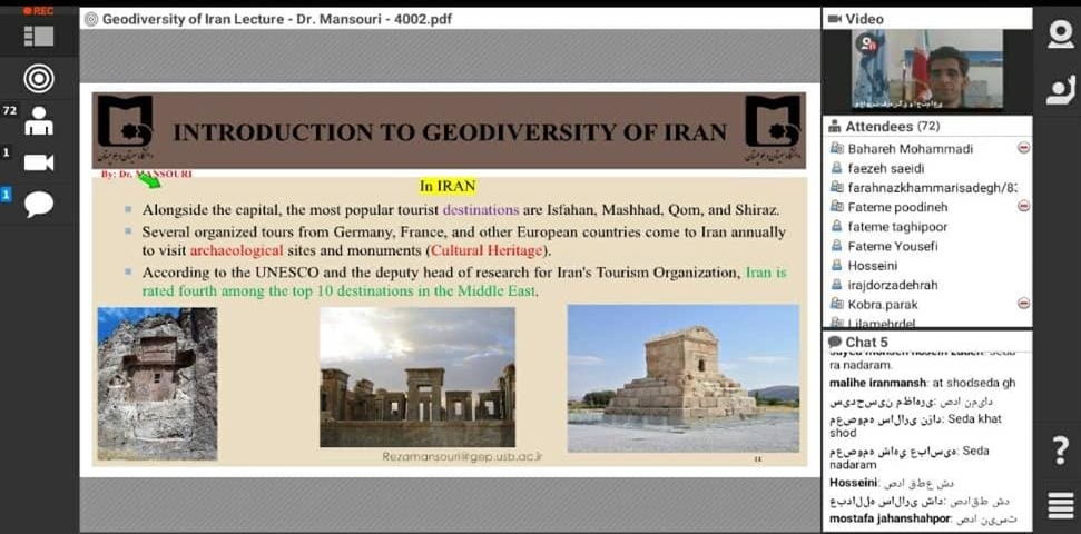 در این جلسه، جناب آقای دکتر رضا منصوری ضمن تببین موقعیت جغرافیایی کشور ایران و نقش و تاثیر آن بر ویژگی های زمین-شناختی، ژئومورفولوژیکی، آب وهوا و دیگر ویژگی های مهم و اثرگذار طبیعی بر گوناگونی پدیده های زمین شناختی و ژئومورفولوژیکی؛ ضمن ارایه مطالب بنیادی و پایه ای در زمینه صنعت گردشگری، انواع آن، تفاوت های بین ژئوتوریسم و اکوتوریسم، مفاهیم ژئودایورسیتی، ژئوسایت، میراث های زمین شناختی و دیگر موارد مهم مربوطه؛ به ذکر نمونه های مهم و مستعد از چشم اندازها و لندفرم های ژئومورفولوژیکی و پدیده های زمین شناختی کشور پرداختند و به توانایی های هر یک از آنها در راستای توسعه و گسترش ژئوتوریسم با اهداف توسعه پایدار پرداختند.