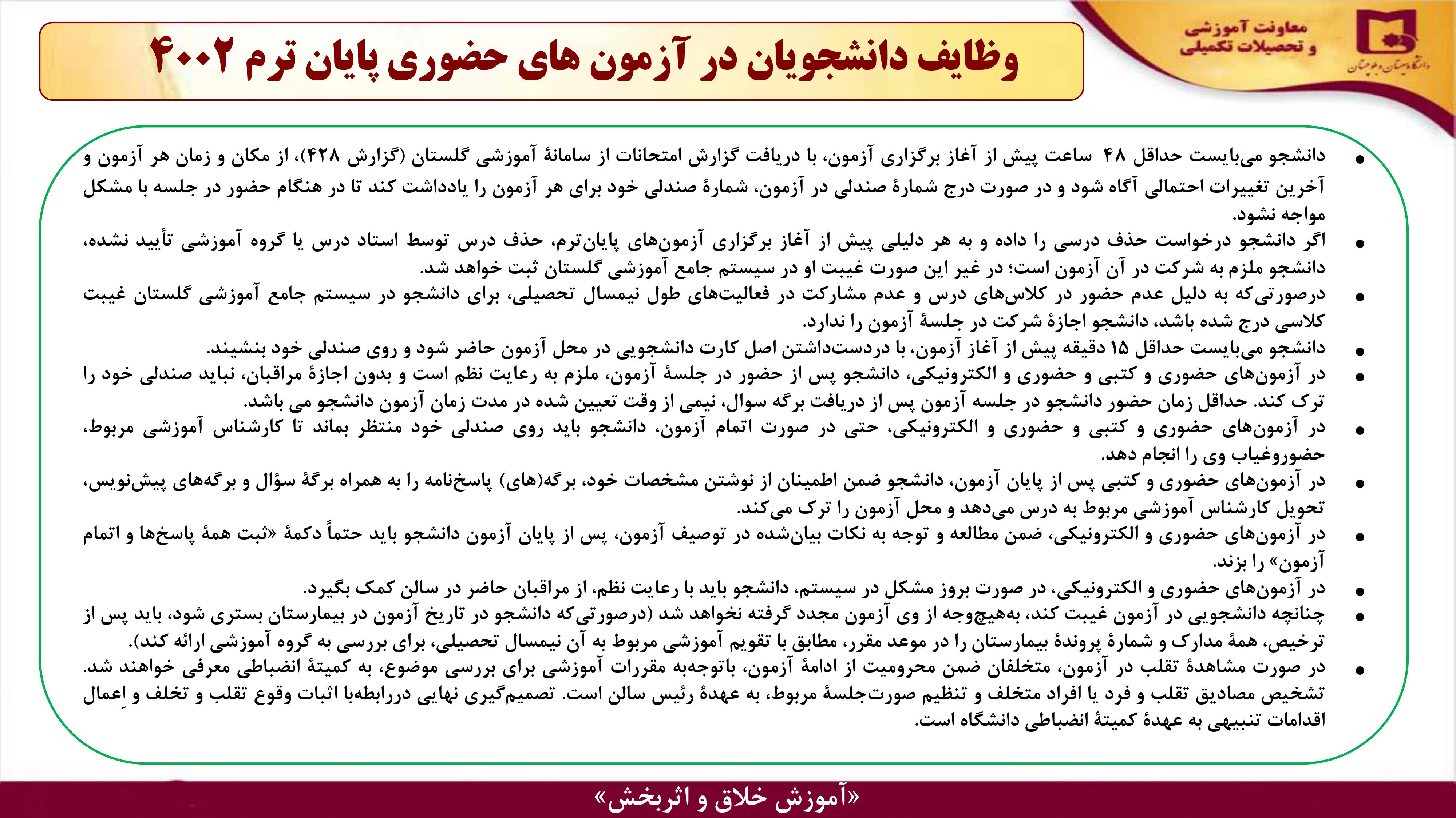 وظایف دانشجویان در آزمون های حضوری پایان ترم 4002 به پیوست اعلام می گردد.