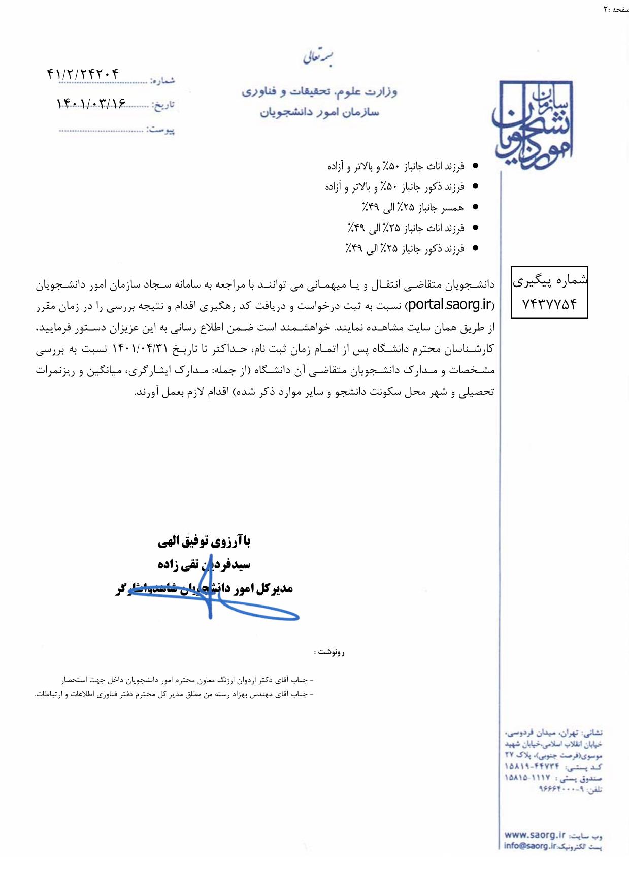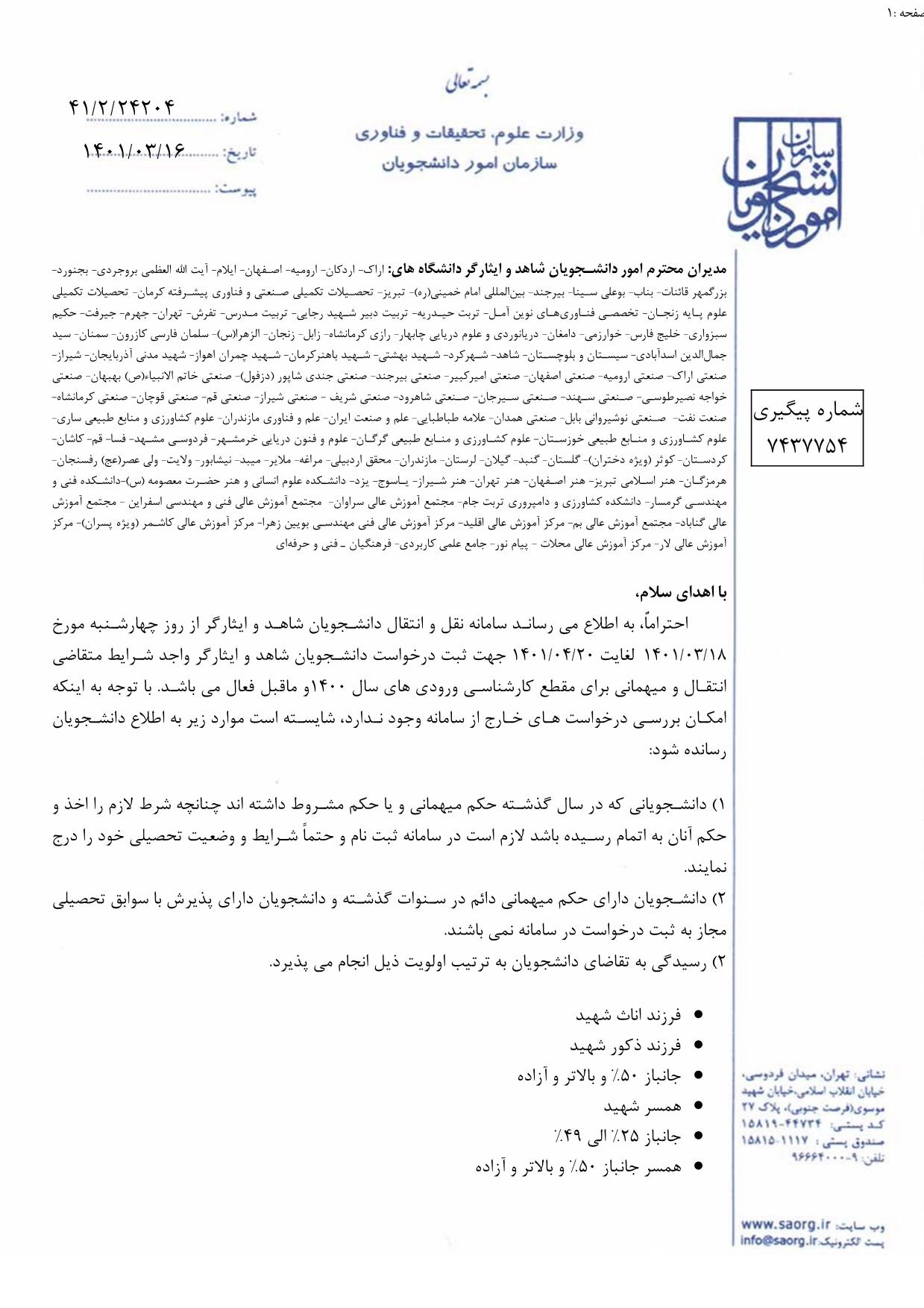 به اطلاع کلیه دانشجویان محترم شاهد و ایثارگر دانشگاه می رساند، سامانه نقل و انتقال دانشجویان شاهد و ایثارگر از روز چهارشنبه مورخ1401/3/18 لغایت 1401/4/20 جهت ثبت درخواست دانشجویان شاهد و ایثارگر واجد شرایط متقاضی نقل و انتقال و میهمانی فعال می باشد.