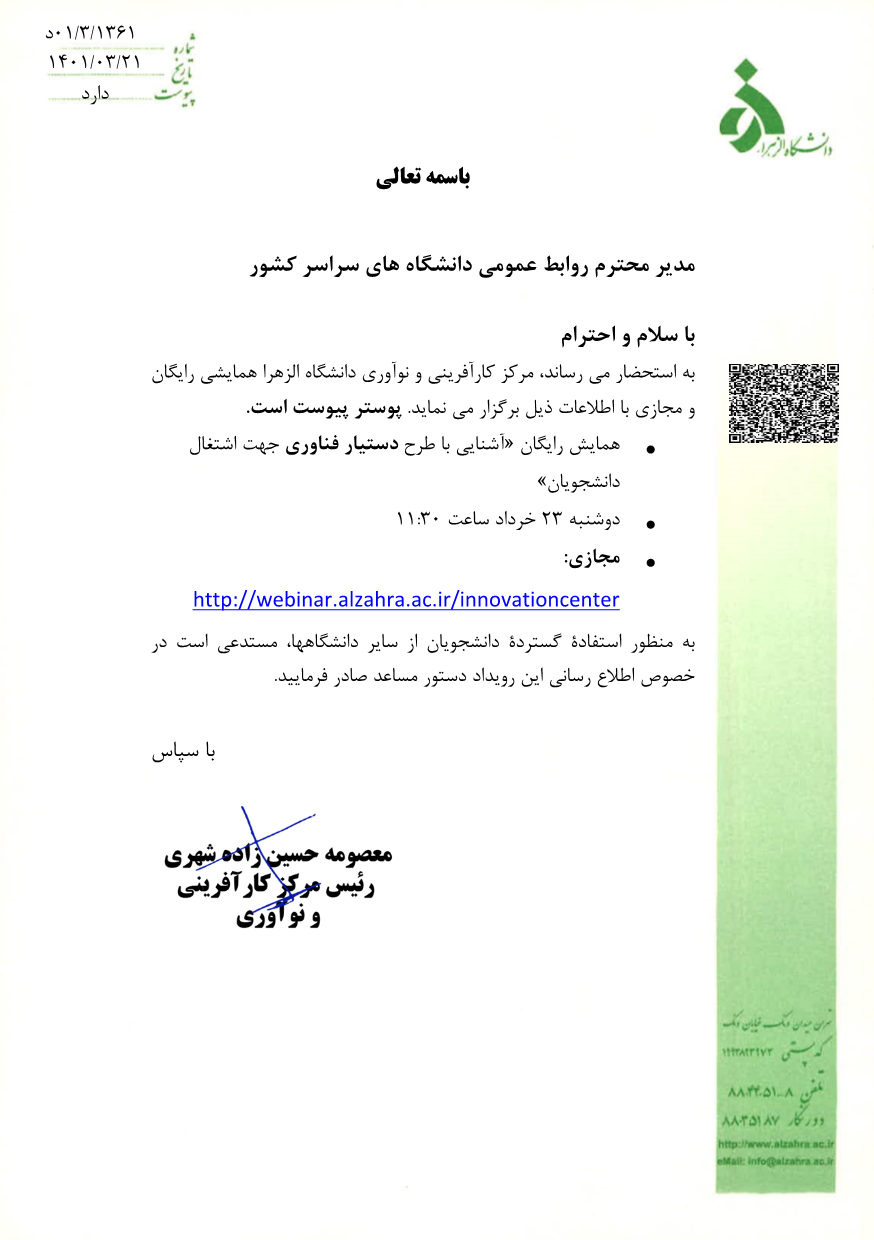 برگزاری جلسه مجازی "آشنایی با طرح دستیار فناوری جهت اشتغال دانشجویان" توسط دانشگاه الزهرا