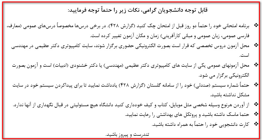 نکات مهم آموزشی و انضباطی در خصوص برگزاری امتحانات پایان ترم به اطلاع دانشجویان محترم می رساند.