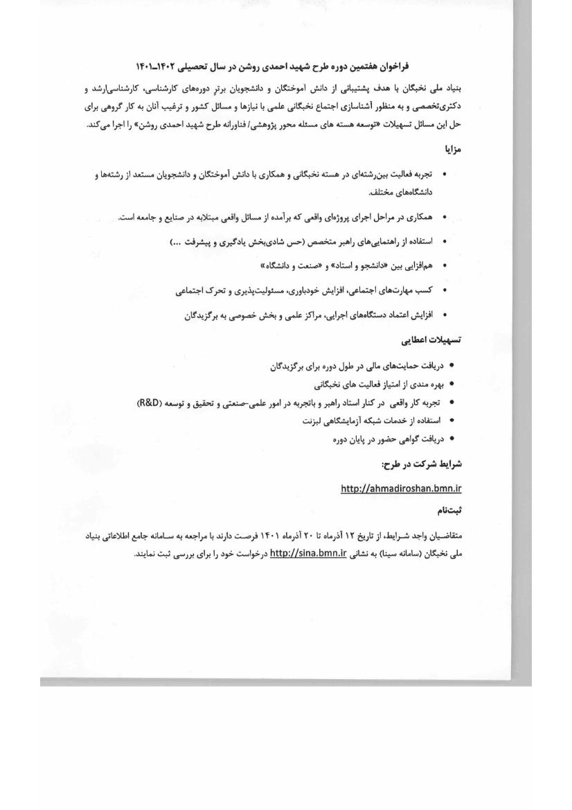 فراخوان هفتمین دوره طرح شهید احمدی روشن (بنیاد ملی نخبگان)