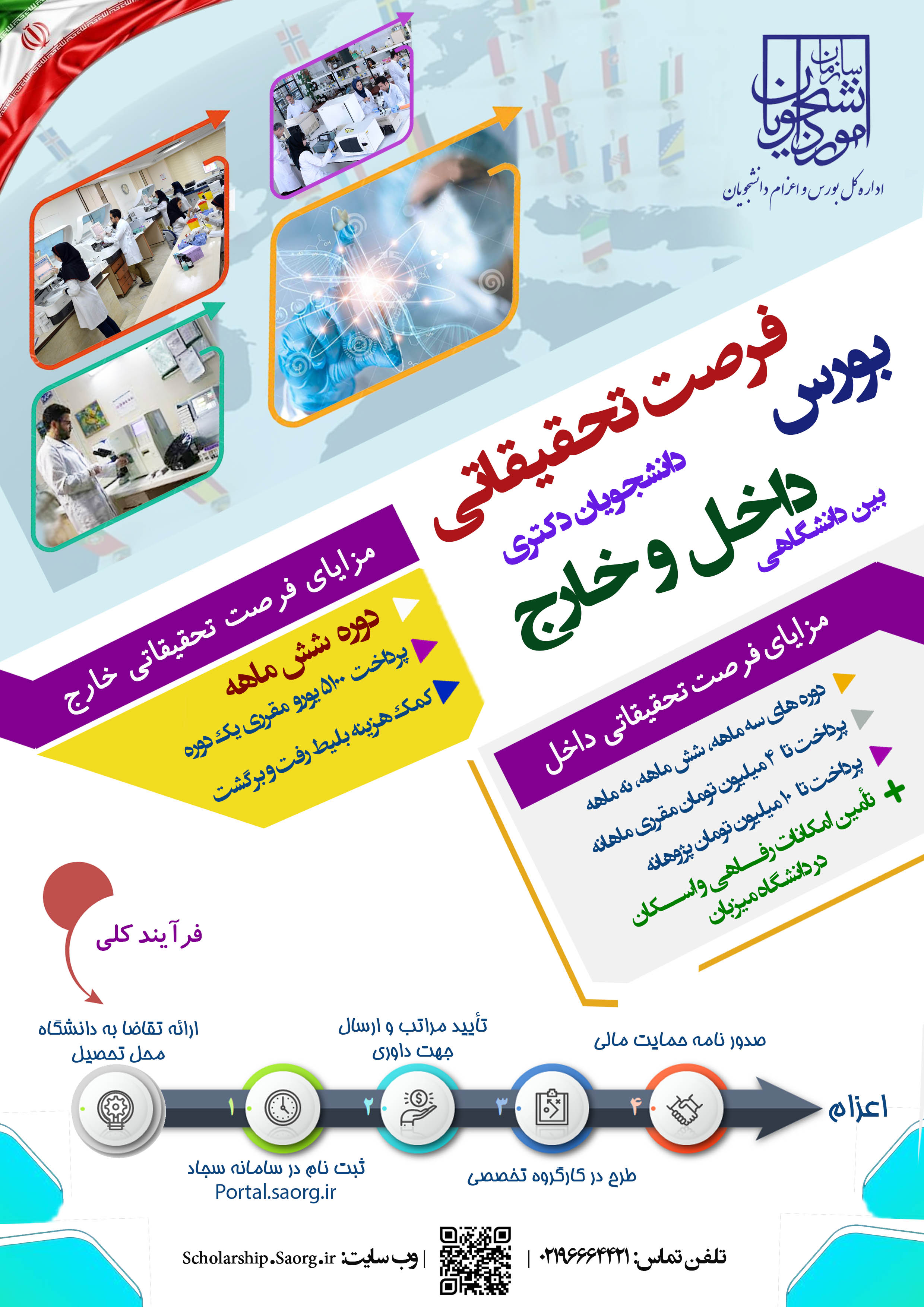 درخواست فرصت تحقیقاتی داخل و خارج کشور برای دانشجویان دکتری آغاز گردیده است، جهت کسب اطلاعات بیشتر به آدرس scholarship.saorg.ir مراجعه شود.