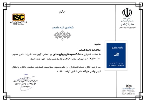 بر اساس رتبه بندی جدید انتشار یافته توسط وزارت علوم، تحقیقات و فناوری، نشریه علمی مخاطرات محیط طبیعی از رتبه ب به رتبه الف ارتقا پیدا کرد.
