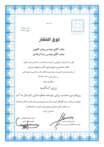 لازم به ذکر است ایشان با تلاش و اهتمام در ارتقای دانش معماری و شهرسازی کشور،از میان تعداد بسیاری از نویسندگان در سالهای 1401---1397  با نگارش کتاب زری اسکیپ و با موضوعیت رویکرد مناسب برای توسعه منظر سازی کم نیاز به آب، موفق به دریافت رتبه افتخار شد.