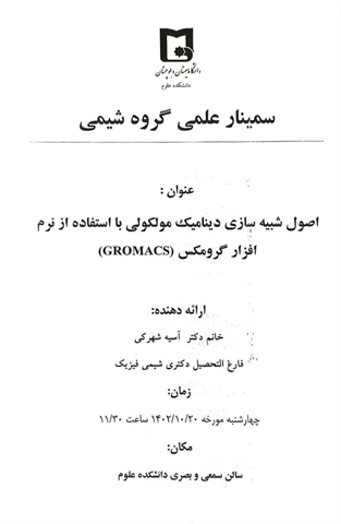 سمینار علمی گروه شیمی با سخنرانی دکتر آسیه شهرکی فارغ التحصیل دکتری شیمی فیزیک دانشکده علوم در روز چهارشنبه مورخه 1402/10/20 ساعت 11:30 در محل سالن سمعی و بصری دانشکده علوم برگزار خواهد شد. از علاقه مندان دعوت میشود در این جلسه حضور به عمل آورند.