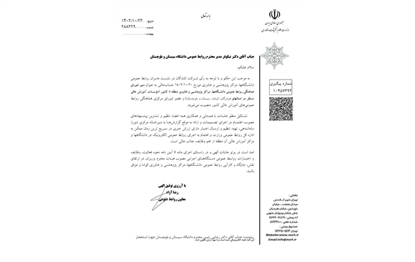 مدیر روابط عمومی دانشگاه سیستان و بلوچستان به عنوان دبیر شورای هماهنگی روابط عمومی دانشگاههای منطقه ۸ و عضو شورای مرکزی هماهنگی روابط عمومی آموزش عالی کشور منصوب شد.
