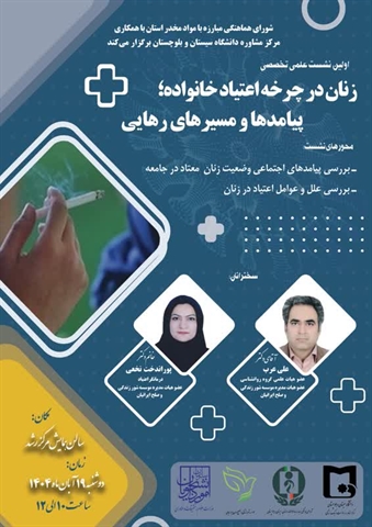 مرکز مشاوره و سلامت دانشگاه سیستان و بلوچستان با همکاری ستاد مبارزه با مواد مخدر استان ،در روز دوشنبه مورخ۱۴۰۴/۰۸/۱۹ اولین نشست تخصصی در حوزه(( اعتیاد در زنان ))را در سالن همایش رشد دانشگاه با حضور جناب آقای دکتر علی عرب( هیات علمی دانشگاه و عضو هیات مدیره موسسه شور زندگی)، خانم دکتر پوراندخت نخعی ( درمانگر اعتیاد و عضو هیات مدیره موسسه شور زندگی ) و خانم دکتر زهرا نیکبخت (مدیر مرکز مشاوره و بهداشت دانشگاه سیستان و بلوچستان )برگزار نمود.در این نشست،اعتیاد یکی از انحرافات شایع در جوانان مطرح شد وگفتگو در نشست مبتنی بر ریشه یابی علل اعتیاد در زنان بر حسب دستاوردهای پژوهشی بود و پیامدهای آن در بستر خانواده و جامعه مطرح شد.
