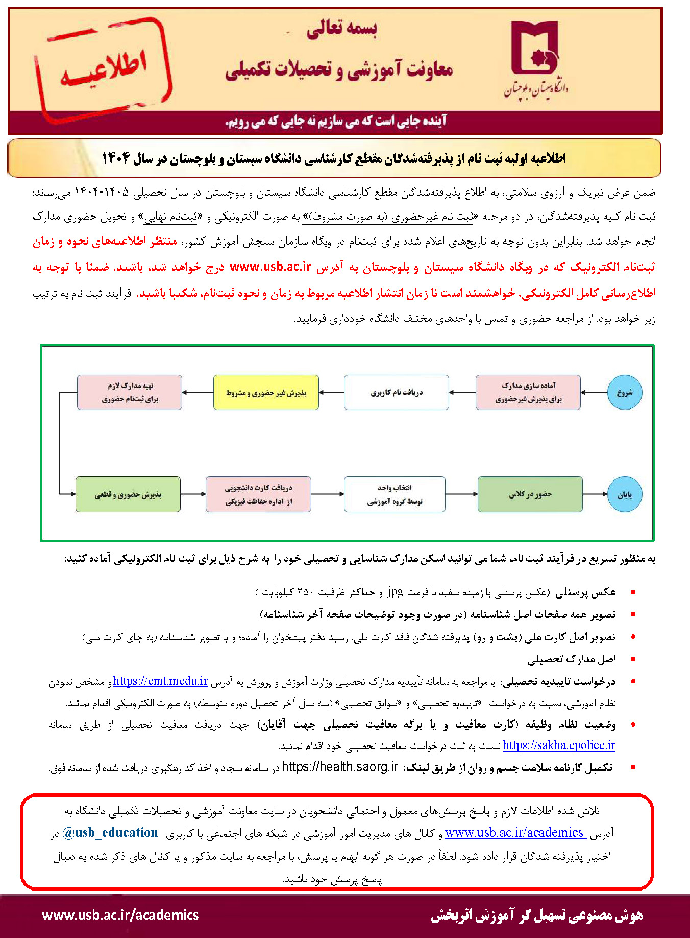 اطلاعیه اولیه ثبت نام از پذیرفتهشدگان مقطع كارشناسي دانشگاه سيستان و بلوچستان در سال 1404