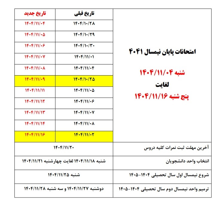 برنامه امتحانات نیمسال اول سال تحصیلی 1404-1405