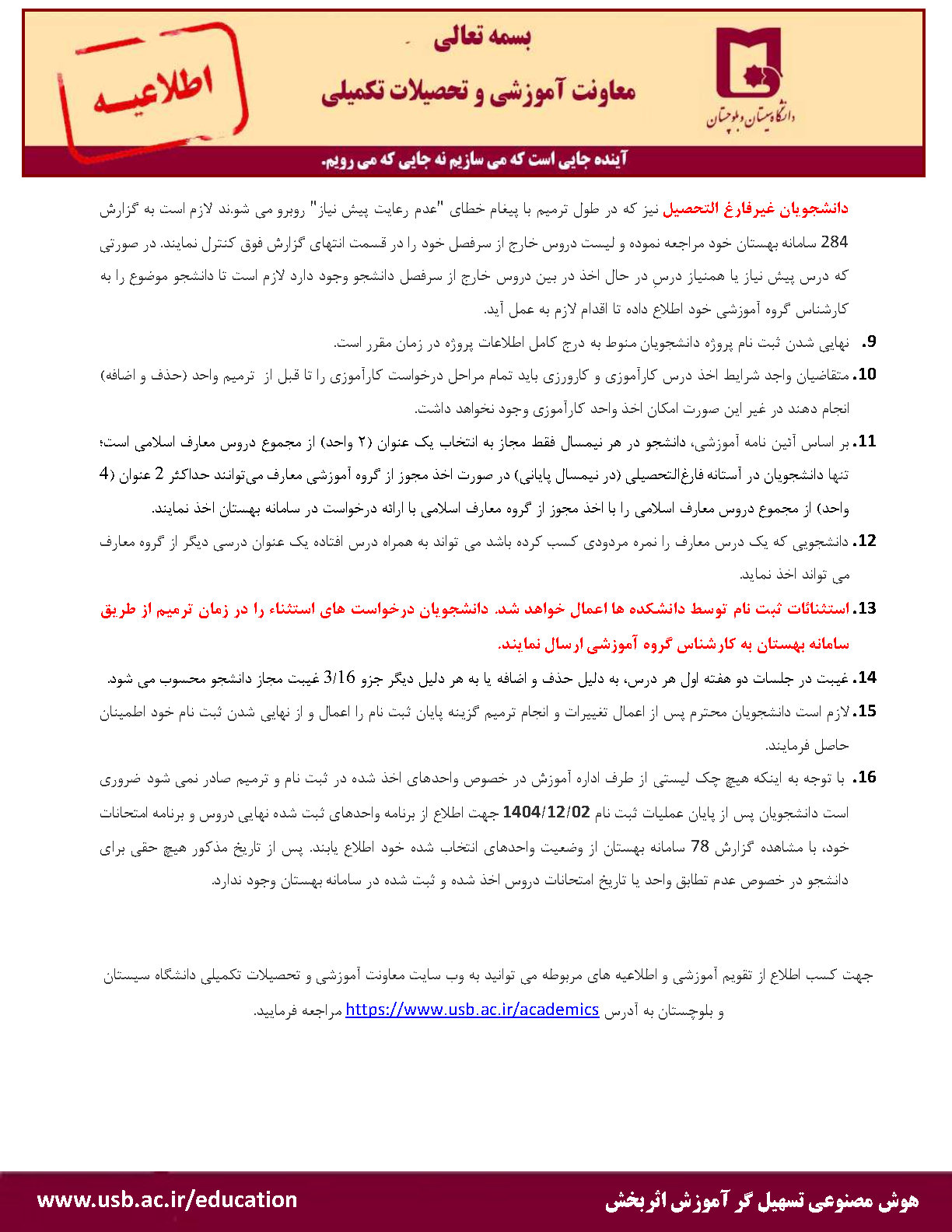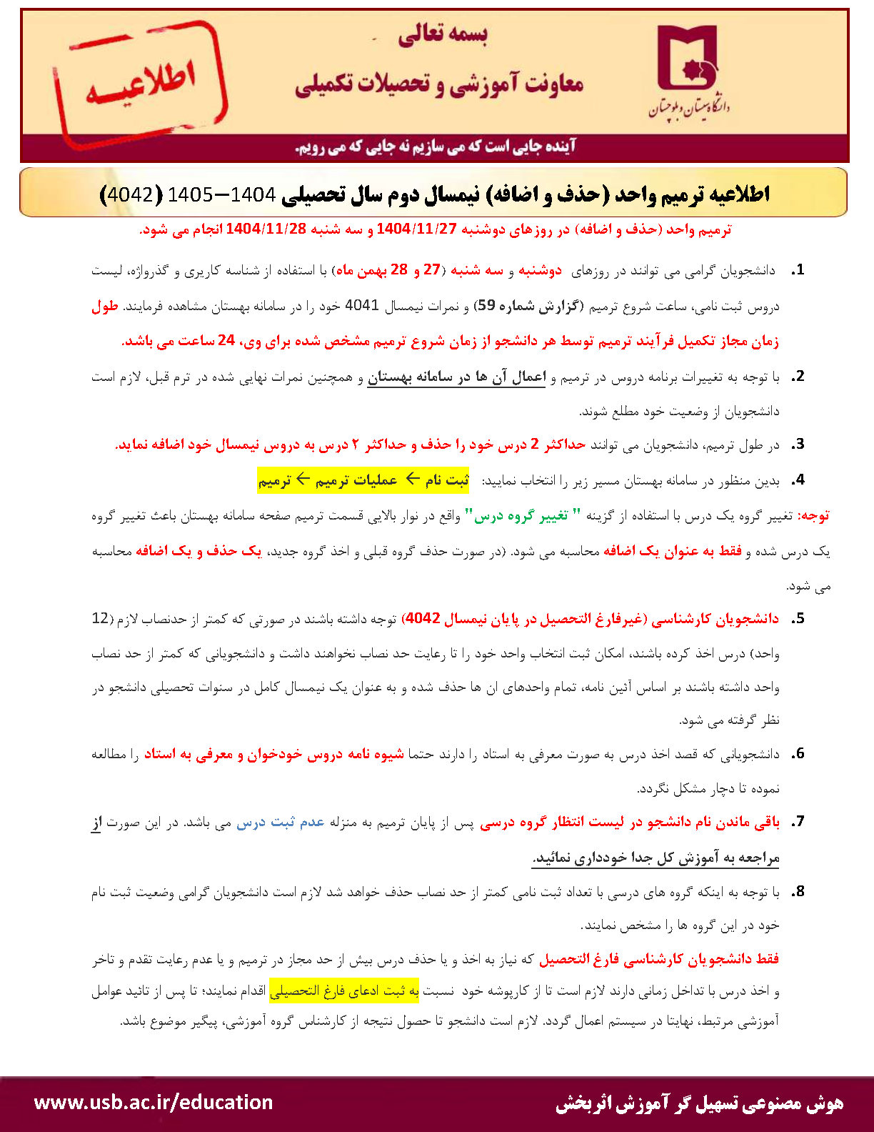 اطلاعیه ترمیم واحد (حذف و اضافه) نیمسال دوم تحصیلی 1404-1405 (4042)